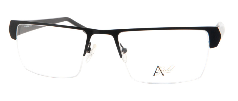 En maskulin glasögonbåge med trådinfästning, passar till ett större ansikte. Tilverkad av metall i glasögonfronten med accetat skalmar.